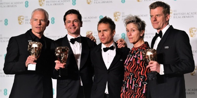 Melhor filme do BAFTA 2018, Três Anúncios Para Um Crime também repete no prêmio britânico as estatuetas para Frances McDormand e Sam Rockwell.